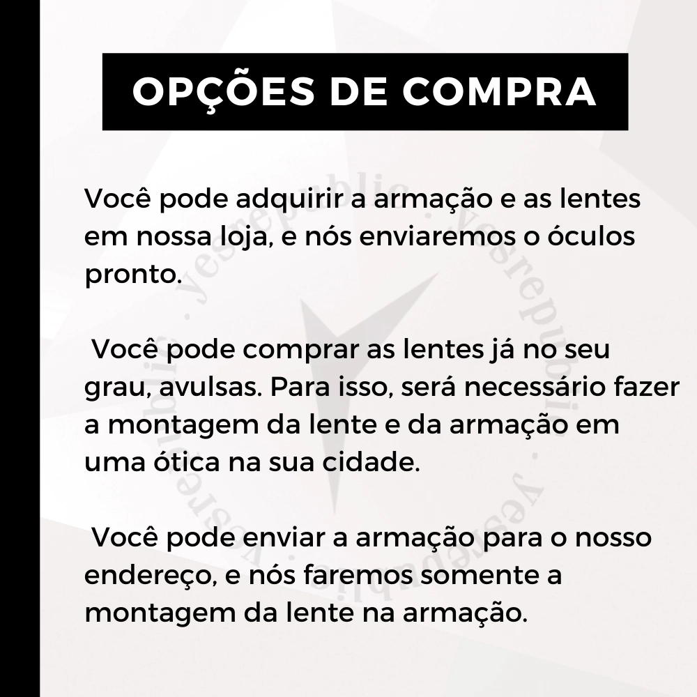 As Yes Republic possuem garantia de 1 ano para as lentes e tratamentos contra possíveis defeitos de fabricação.